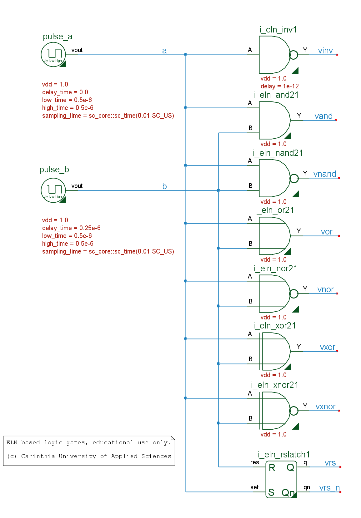 .) A logic library to allow logic functions within a ELN cluster. Please note, this only makes sense for very small logic functionality needed. If you need more functionality within ELN, consider using TDF models for logic and embed them with ELN/TDF sinks and TDF/ELN sources.Furthermore, each two-port input gate require three PWL sources - from COSEDA I got the proposal to use a resistor network on the inputs and only one PWL on the output. Definitely something I am going to try out.