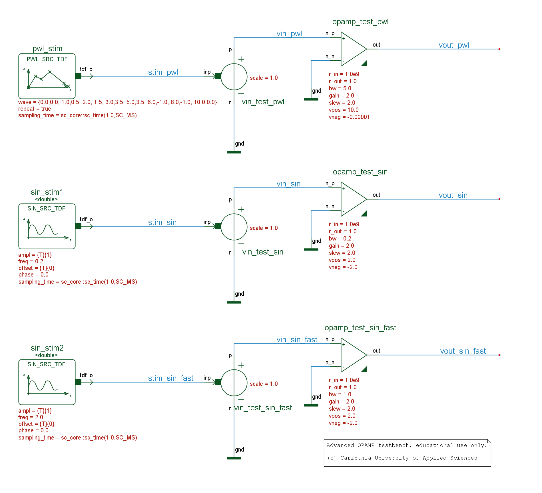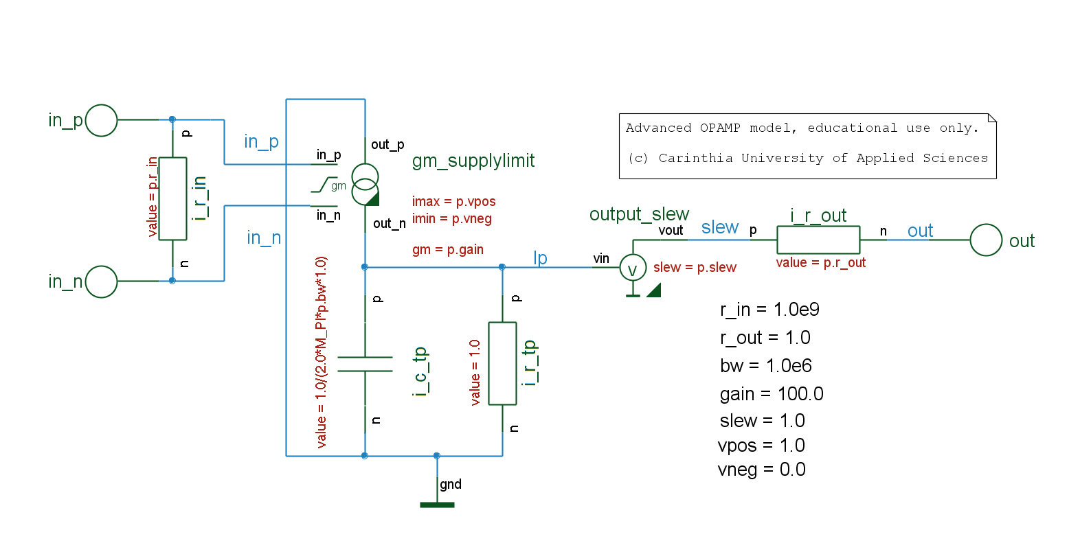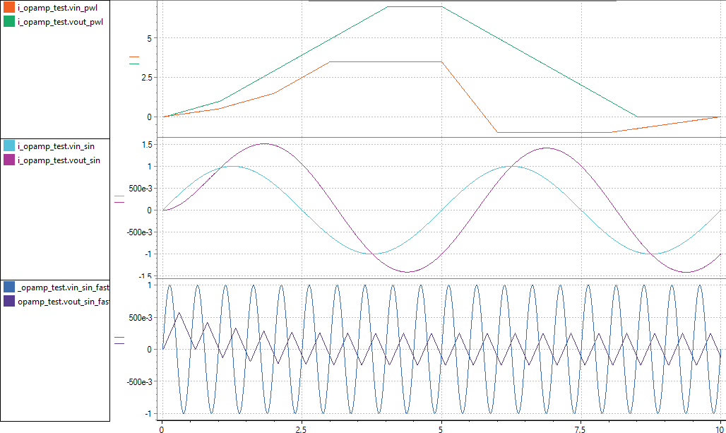 .) A OPAMP model library containing supply boundaries and a slew rate limiter, besides the classic DC gain and (3dB) bandwidth properties. Click on the images to open a larger version.