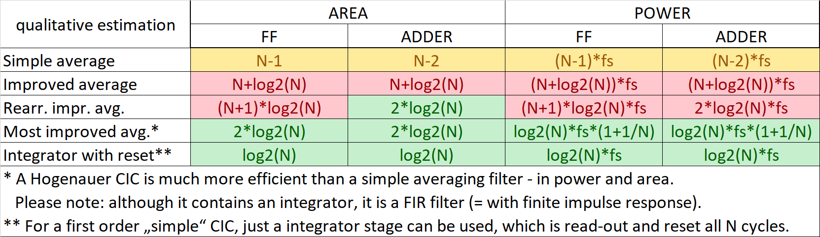 In the first step, we create an integrator where we add the actual and subtract the Nth sample using a N-stage differentiator. The integrator needs only log2(N) FF and log2(N) half adders. So not really better than before...
